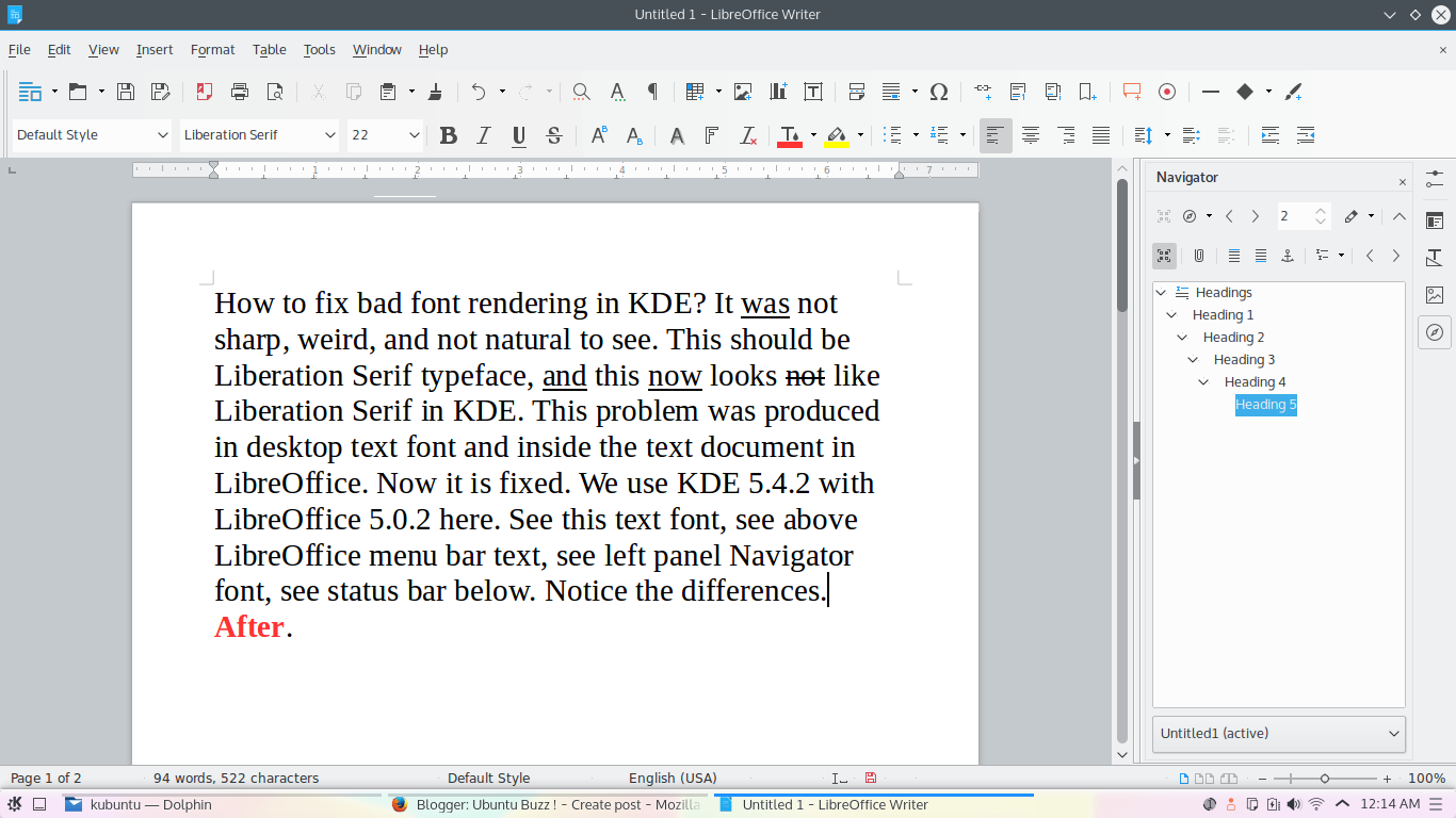 Before the settings, LibreOffice interface looks like this. This happens in KDE 5.4.2 LibreOffice 5.0. Notice the menu bar text, toolbar standard text, document text, left panel Navigator text, and the status bar text. They are not natural to see. In other word, ugly.